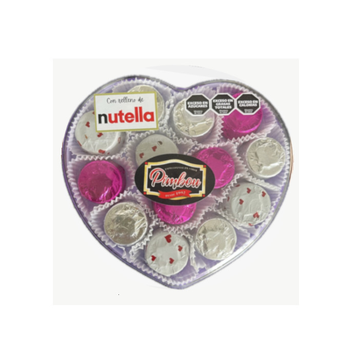 Bombones de chocolate con leche, rellenos de nutela, presentados en un elegante estuche con forma de corazón. Ideal para regalar. Contenido neto: 165 g.